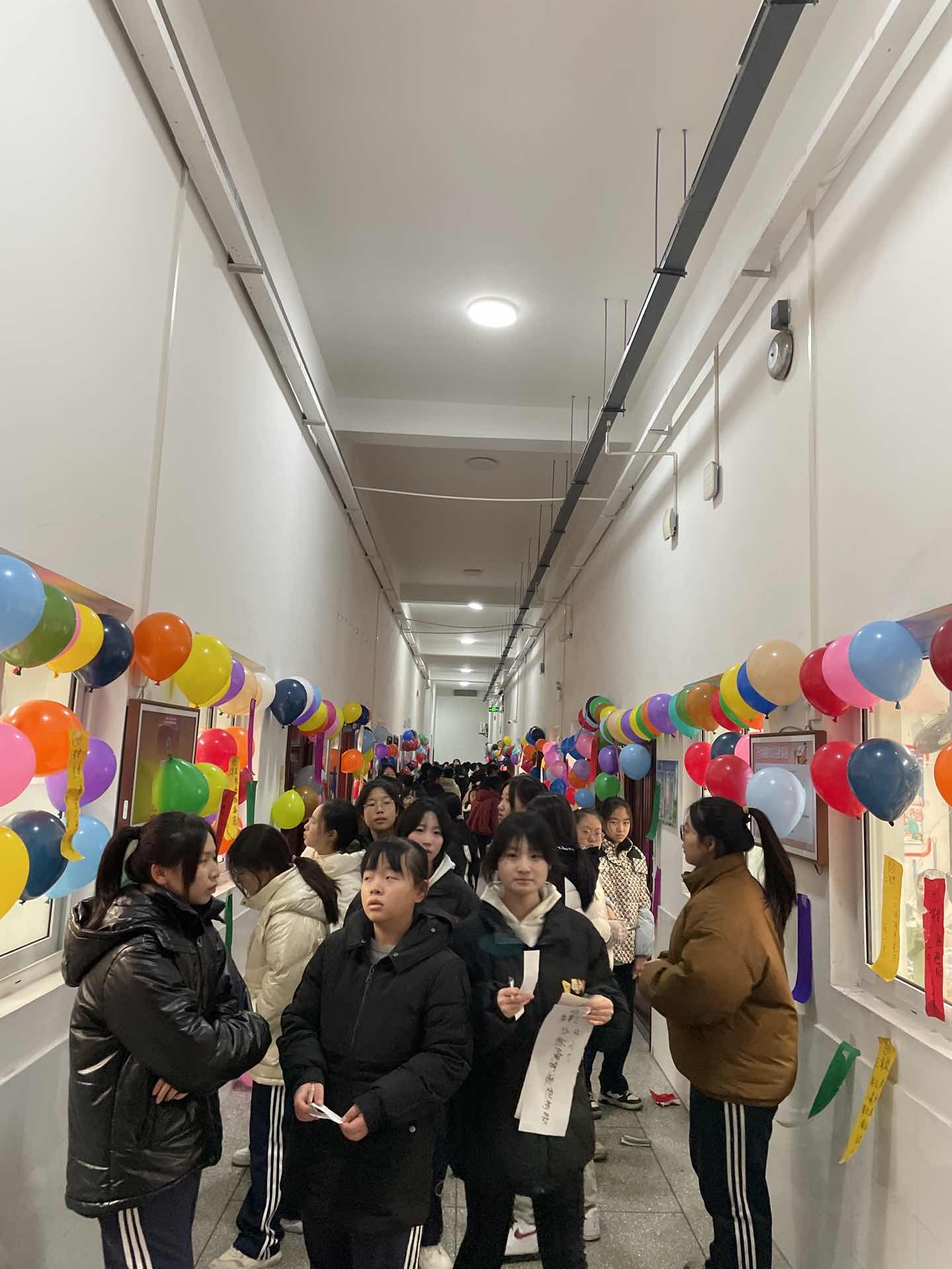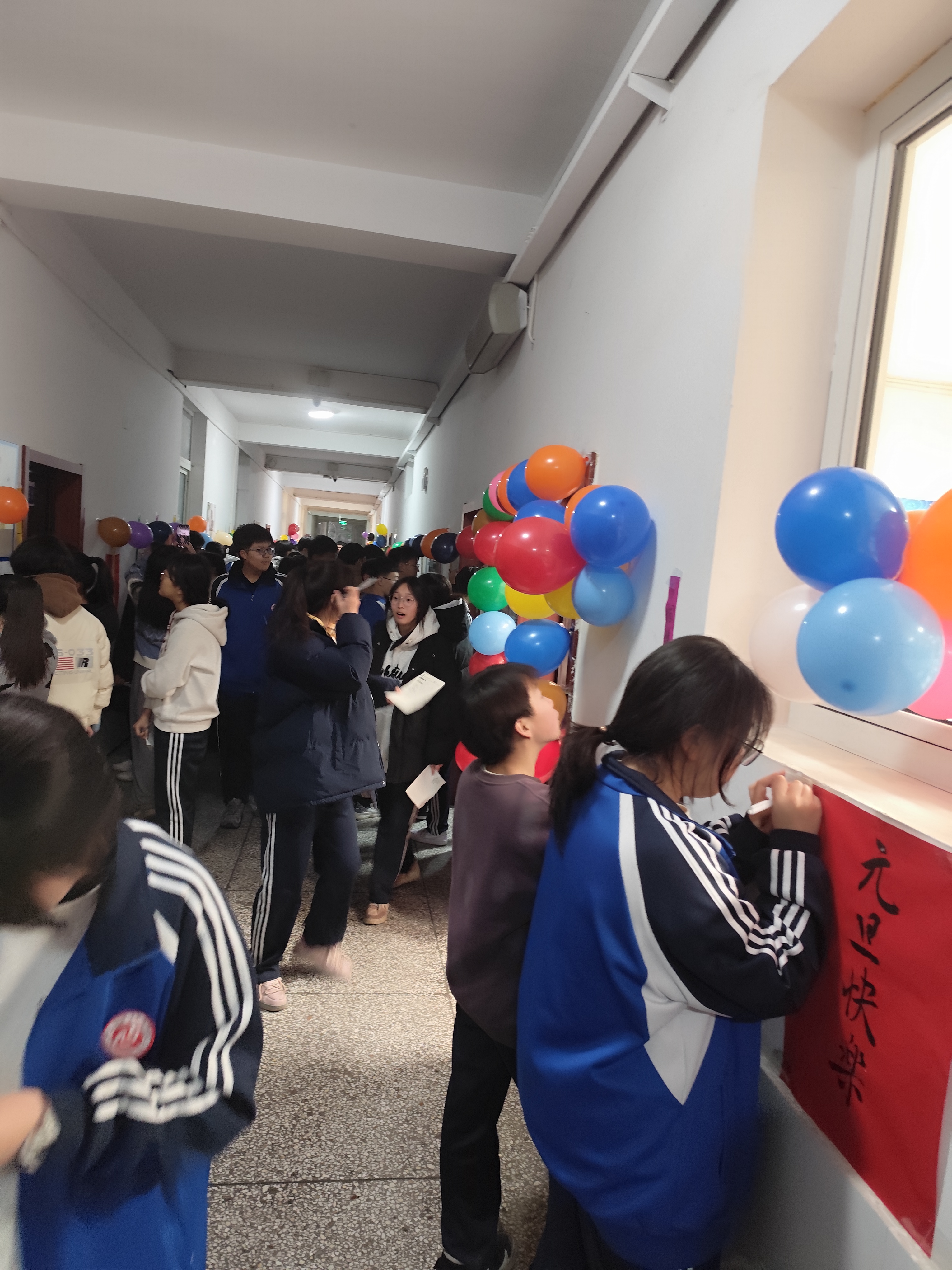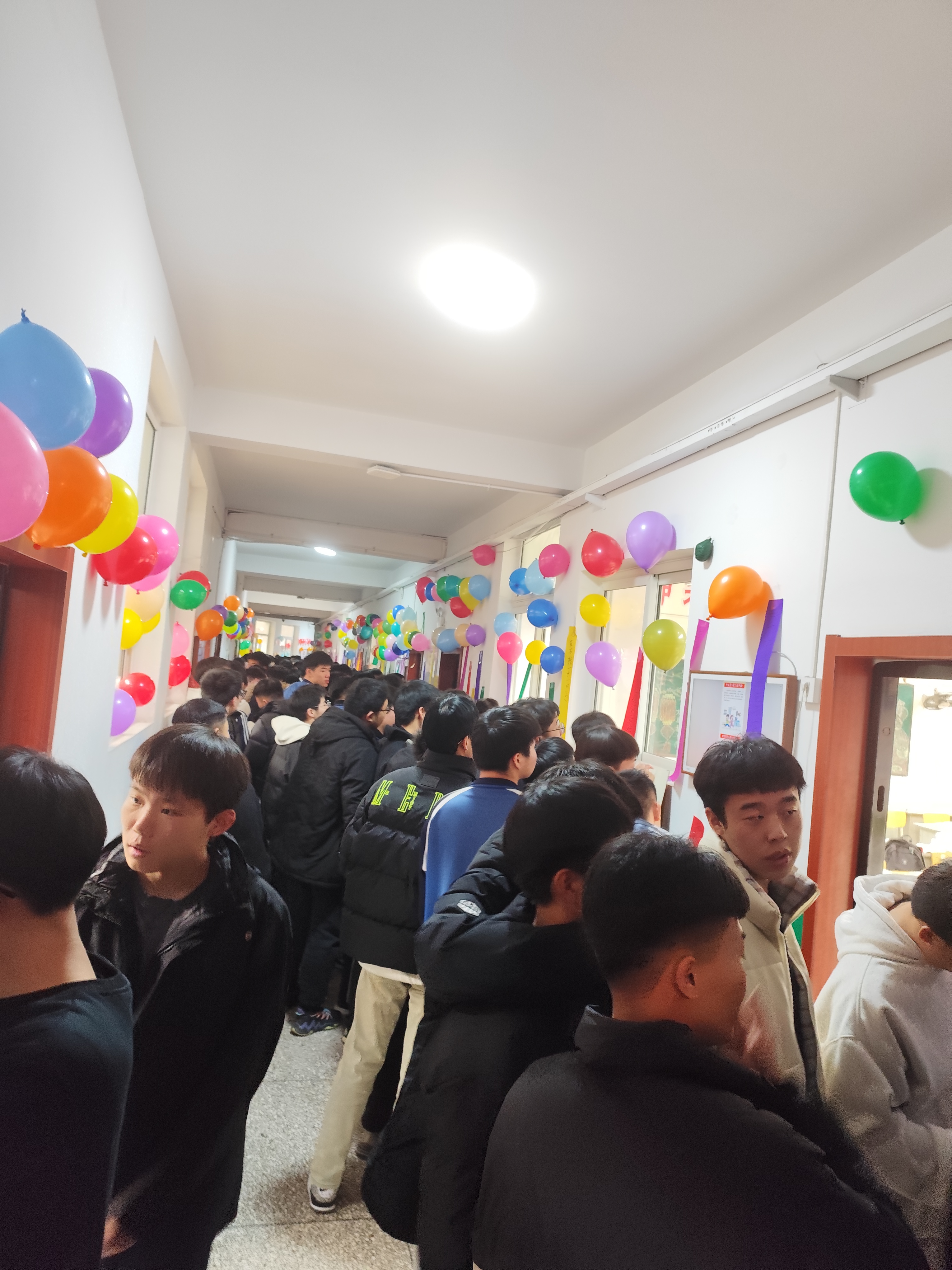 挂满气球的楼道格外喜庆。活动现场,学生们结伴而行,穿梭于字里行间,时而低头沉思,时而低声交流,共同揭秘那些藏在字里行间的谜底。灯谜内容丰富多彩,有字谜、动物谜、成语谜以及诗词谜等多种形式。精美的彩条舞动飘扬,将教学楼装扮得活力满满。