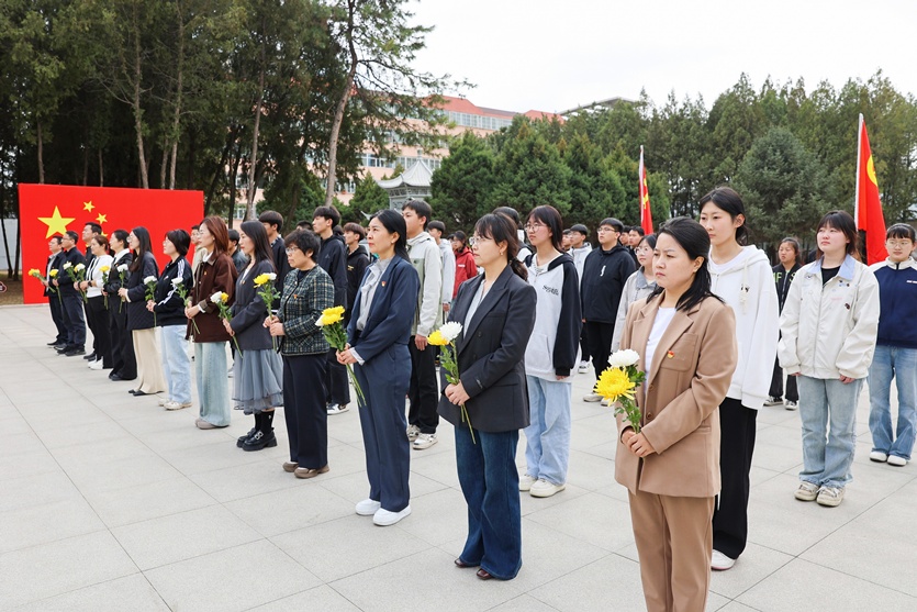 雄壮的国歌声振奋人心,向烈士纪念碑敬献花篮、向革命先烈默哀一分钟......在场师生深切缅怀革命先烈的丰功伟绩,表达了对他们的深深哀思。